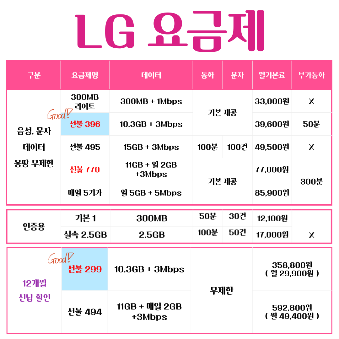 📍 LTE396, LTE459 등 다양한 요금제 선택 가능