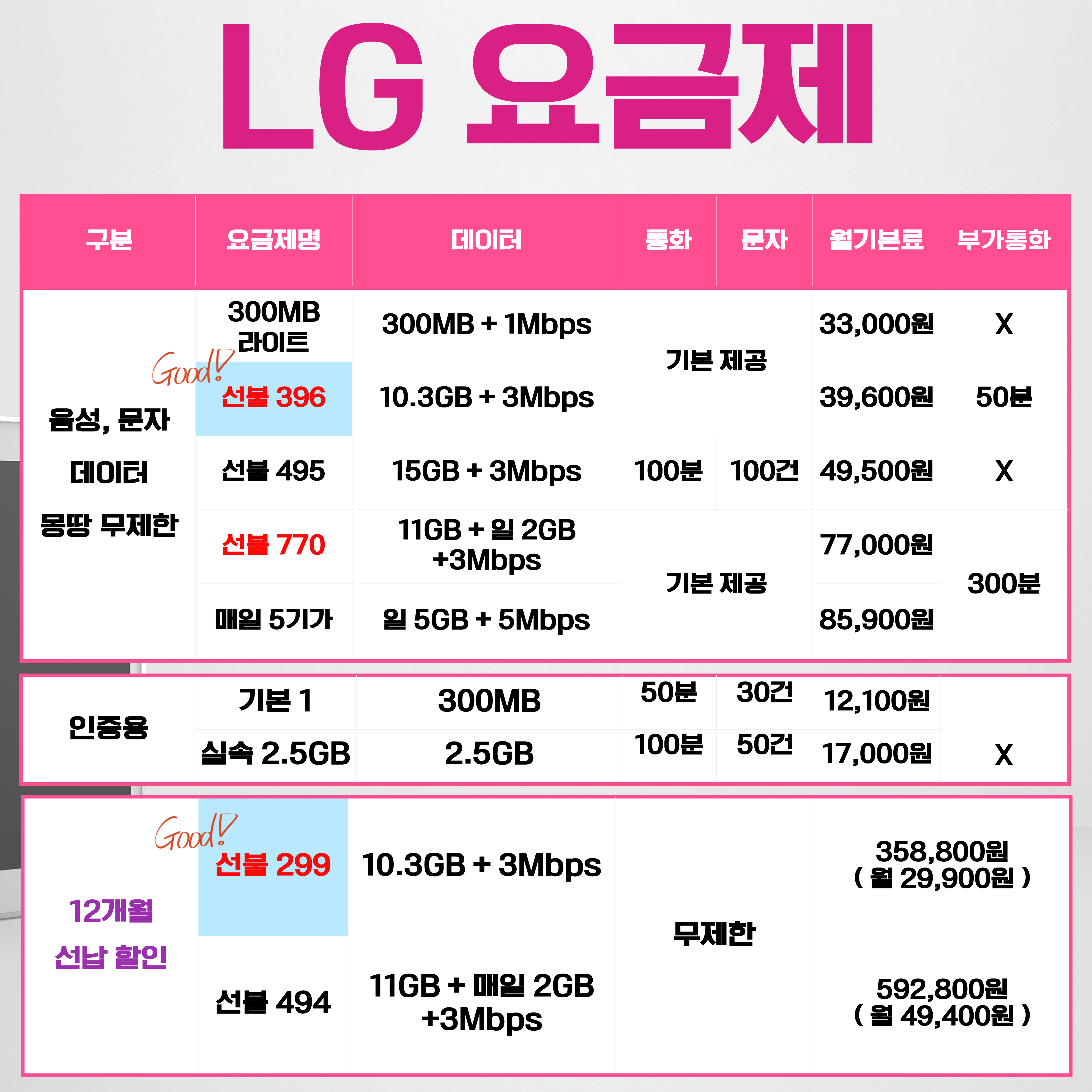 LTE396 39,600원 10.3GB 후 3Mbps 요금제 변경 시 300MB 제공